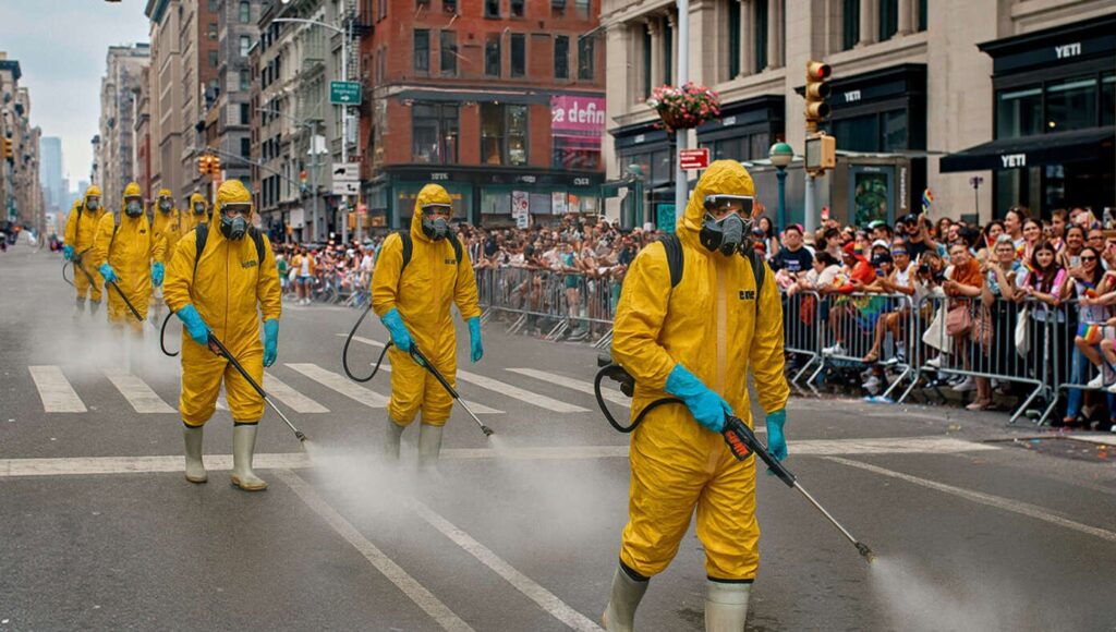 One participant in the Disinfectant Parade commented, “Ugh, gross… but hey, happy Pride!” as they navigated through large piles of dirty and potentially infectious parade waste.
